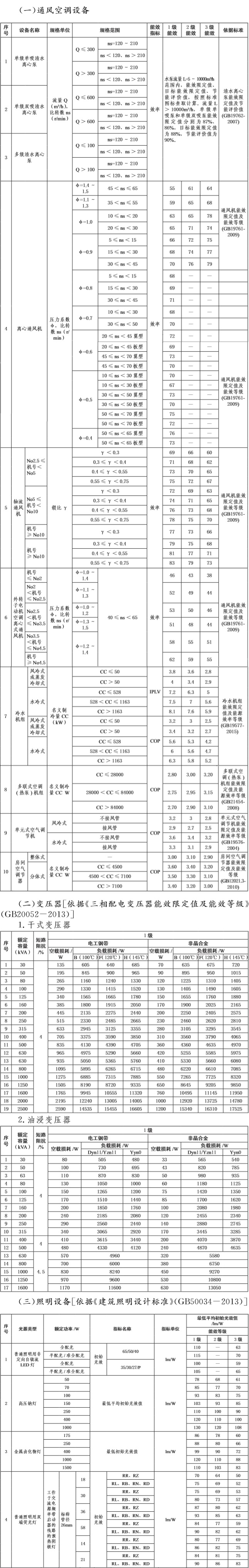 按照《能源效率標(biāo)識(shí)管理辦法》(國(guó)家發(fā)展改革委、國(guó)家質(zhì)檢總局2016年第35號(hào)令)要求,由國(guó)家發(fā)展改革委會(huì)同國(guó)家質(zhì)檢總局、國(guó)家認(rèn)監(jiān)委規(guī)定統(tǒng)一適用的產(chǎn)品能效標(biāo)準(zhǔn)、實(shí)施規(guī)則、能效標(biāo)識(shí)樣式和規(guī)格。本部分結(jié)合《清水離心泵能效限定值及節(jié)能評(píng)價(jià)值》(GB19762-2007)、《通風(fēng)機(jī)能效限定值及能效等級(jí)》(GB19761-2009)、《冷水機(jī)組能效限定值及能源效率等級(jí)》(GB19577-2015)、《多聯(lián)式空調(diào)(熱泵)機(jī)組能效限定值及能源效率等級(jí)》(GB21454-2008)、《單元式空氣調(diào)節(jié)機(jī)能效限定值及能源效率等級(jí)》(GB19576-2004)、《房間空氣調(diào)節(jié)器能效限定值及能效等級(jí)》(GB12021.3-2010)等標(biāo)準(zhǔn)規(guī)定,給出了通風(fēng)空調(diào)設(shè)備的能效等級(jí)劃分依據(jù);結(jié)合《三相配電變壓器能效限定值及能效等級(jí)》(GB20052-2013),給出了變壓器的能效等級(jí)劃分依據(jù);結(jié)合《建筑照明設(shè)計(jì)標(biāo)準(zhǔn)》(GB50034-2013),給出了照明燈具的能效等級(jí)劃分依據(jù)。
